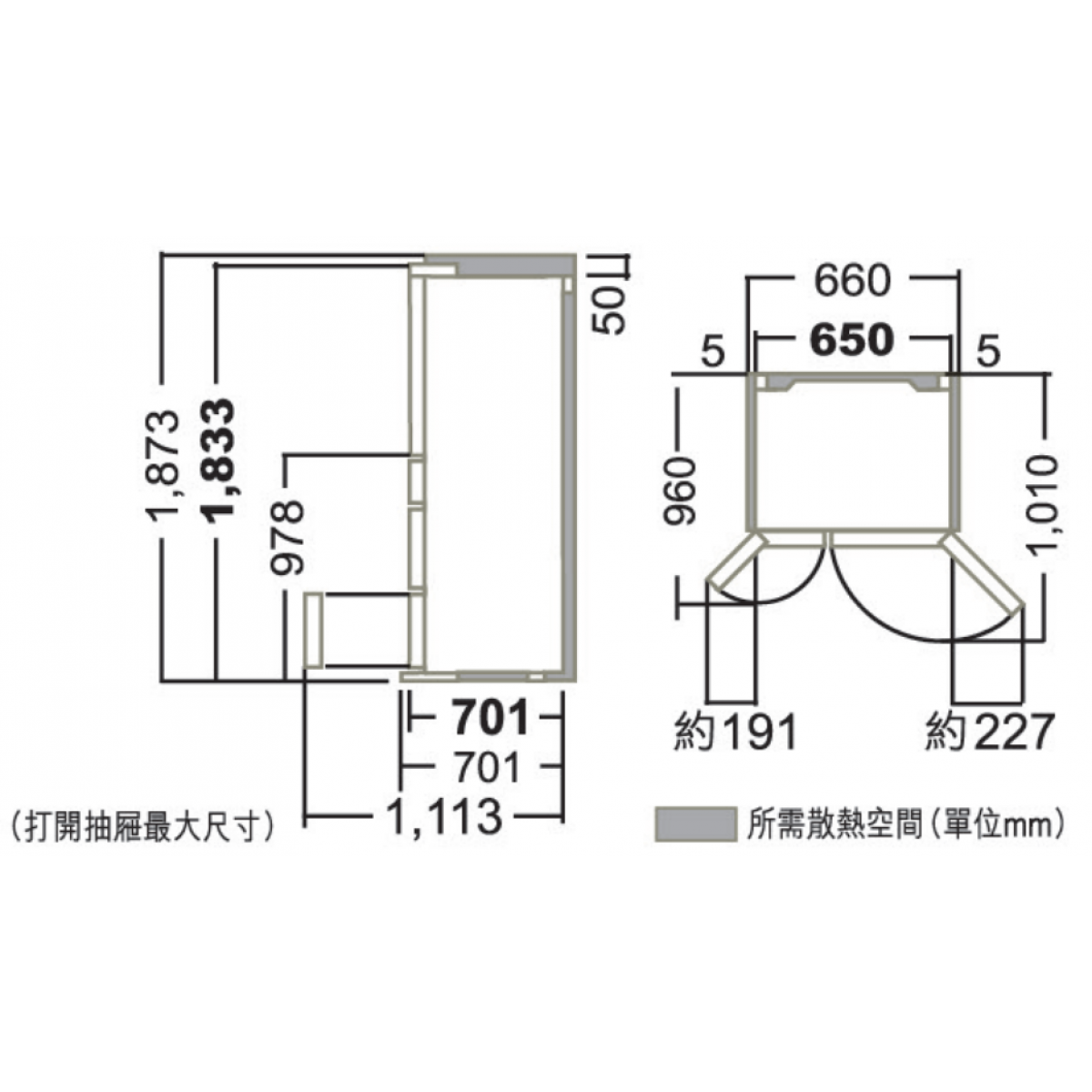 650 (闊) x 1,833 (高) x 701 (深) 毫米